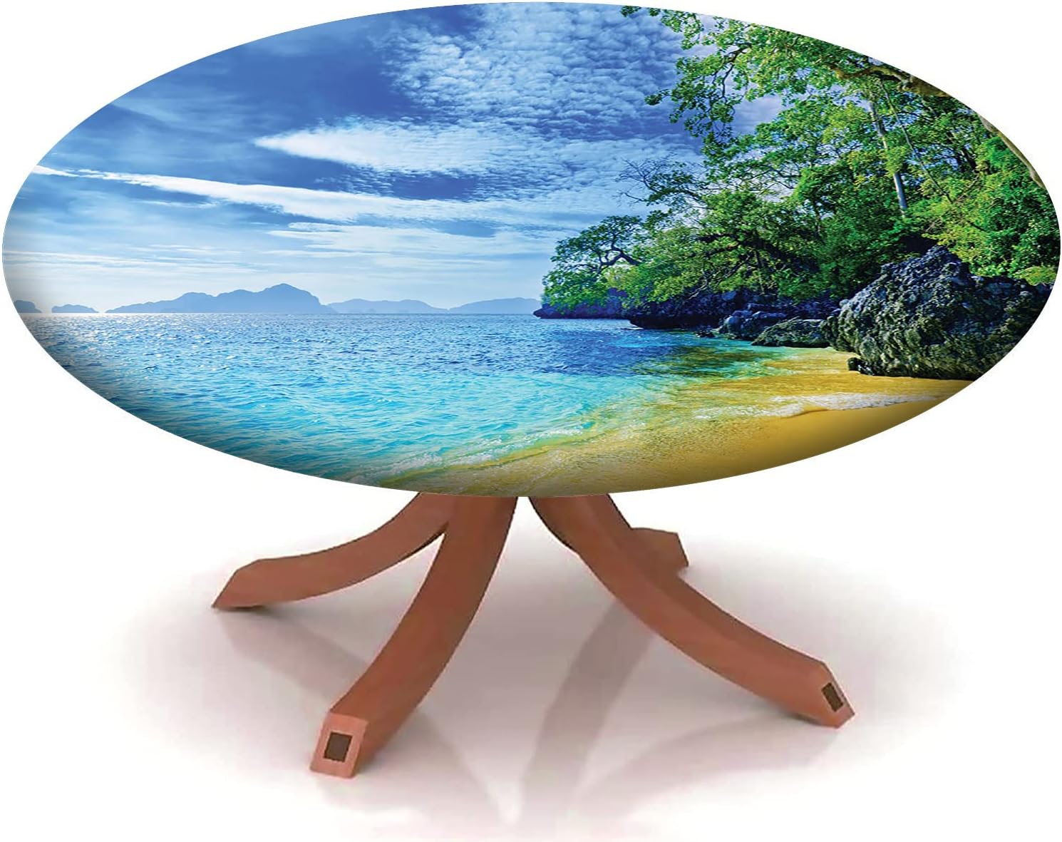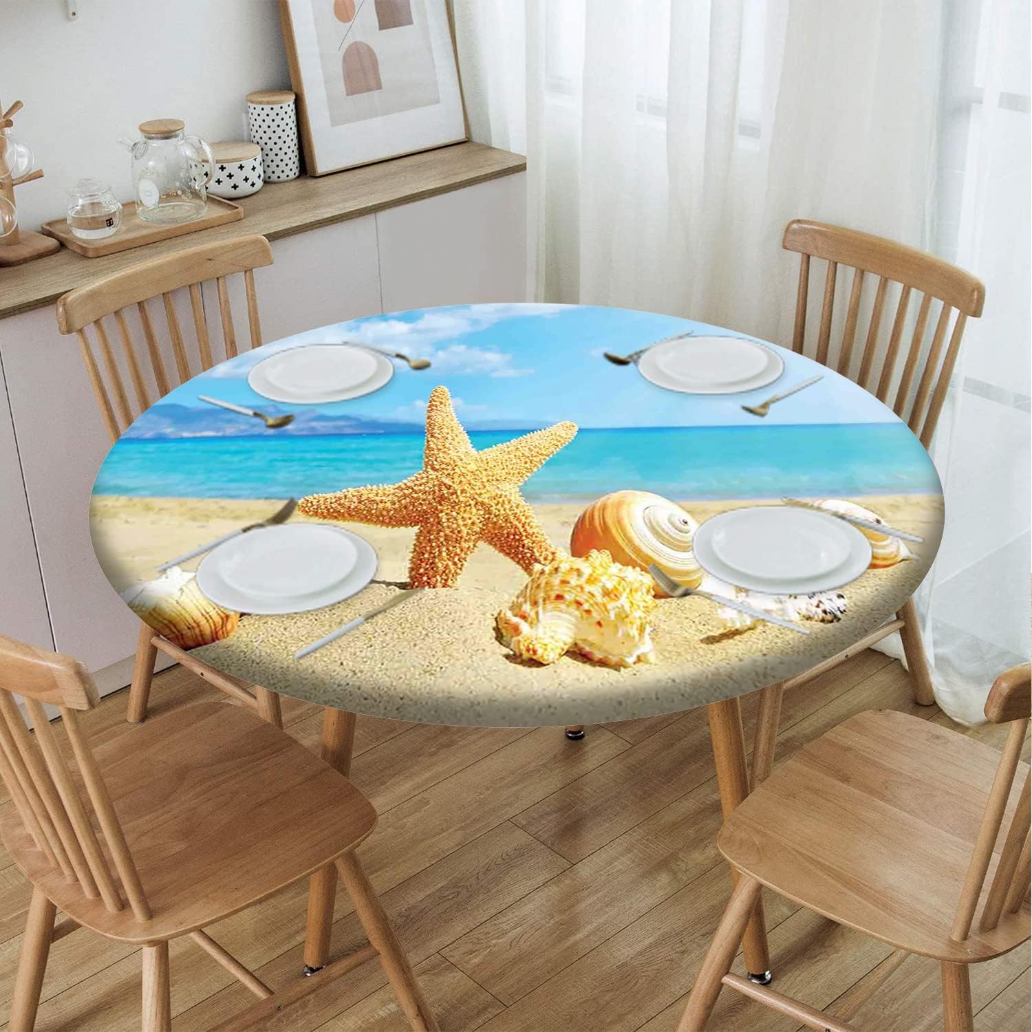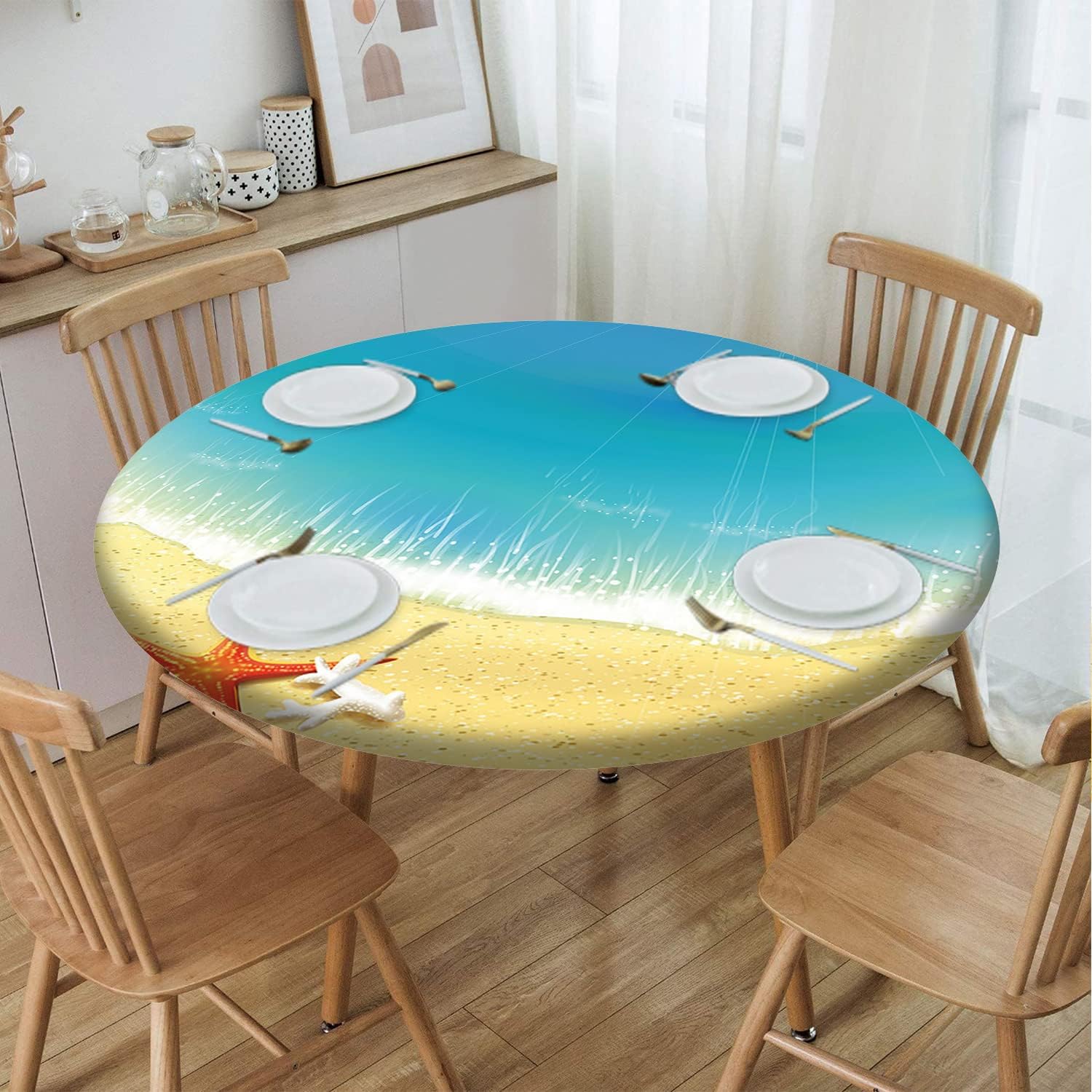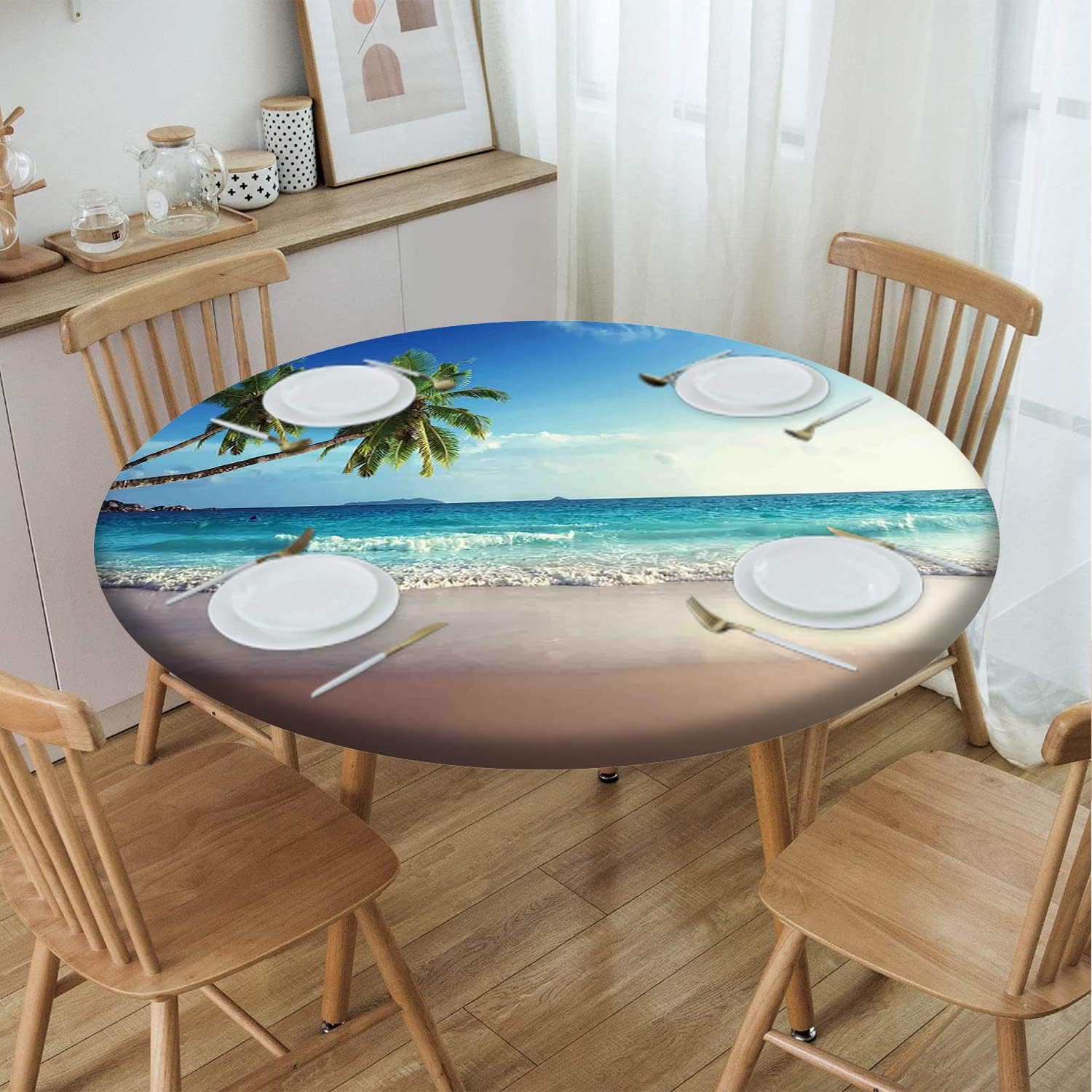 Beach Pattern Round Fitted Tablecloth,Elastic Edge,Suitable for Catering and Kitchen Can Wipe Dining Round Table coverr,Blue Green,for 57" to 68" Round Tables