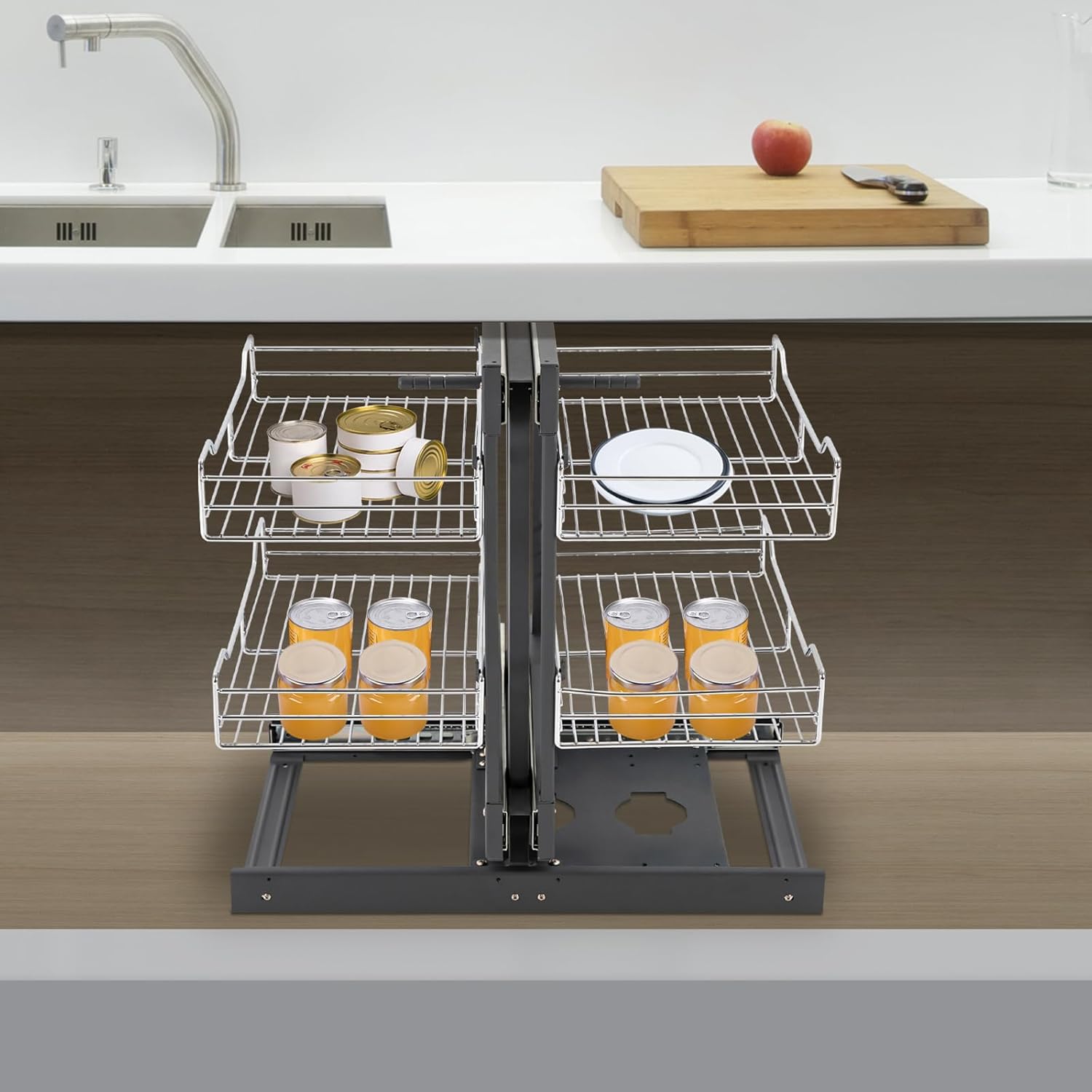 DetailsSoft-closing Device: It has a slide cushion soft-closing device on the rotating axis that prevents the shelf from closing with a bang and waking your sleeping child.Rounded Corners: The edges of the basket as well as the shelf are made with rounded corners, which are comfortable and beautiful without hurting your hands.ApplicationYou can install it in various cabinet corners to place pots and pans, containers, spice jars, etc.Specification Material: Iron + Aluminum + Tempered GlassColor: BlackSurface Treatment: Powder CoatingSpecial Feature: AdjustableMounting Type: Pull OutShape: RectangularEach Basket Max.Load-bearing Capacity: 15kg/33lbsPackage Size: 92.5*23.5*56.5cm/36.42*9.25*22.24inMain Shelf Size(L*W*H): 86.3*45.7*53.3cm/34 *18 *21 inDoor Opening Width:≥ 36cm/14 inGross Weight: 20.5kg/45.2lbsEach Net Weight: 18.8kg/41.5lbsPackage Included2*Main Shelves4*Baskets1* English ManualMounting AccessoriesNotes1. Please note that check the correct size of your cabinet before buying this item.2. The item is common to left and right, according to the direction of use. You need to flip the direction of the side shelf when installing.3. If there are drawers above the blind corner pull-out cabinet please pay attention to the internal height of the cabinet (H ≥ 56cm/22inch can be installed).4. Please do not use sharp cleaning tools to wipe the main shelves and baskets to prevent damage to the product's appearance.5. Please allow the slight color difference caused by the shooting light and 1-3cm error due to manual measurement, and make sure you do not mind before you place the order.