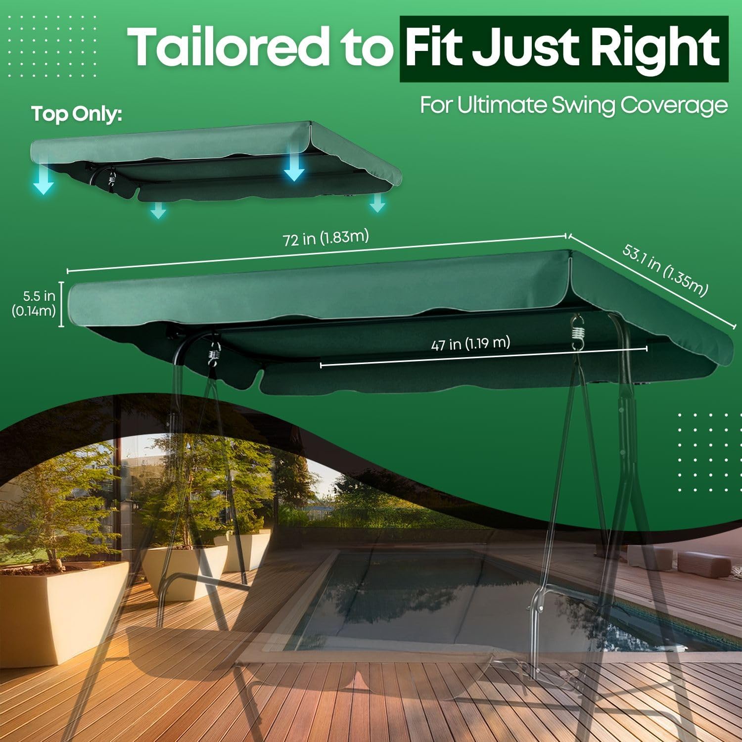 Reliable way to relax on lazy summer for years to come. Create a lounging area with this beautiful swing canopy top by yourself. Spacious and stylish replacement swing canopy provides you shade from the sunshine. Enjoy comfortable rest time in the cool under the durable UV blocking canopy. As size of swing chair varies, please CHECK the detail size of your chair for the best match before you place an order。Swing frame shown in picture just for demonstration only, Not includedSpecification:Material: 180-gram PolyesterColor: GreenCanopy Top Size: 66" L x 45" WScalloped Egde: 5-1/2" LPackage Content:1x High-quality Swing Canopy Top