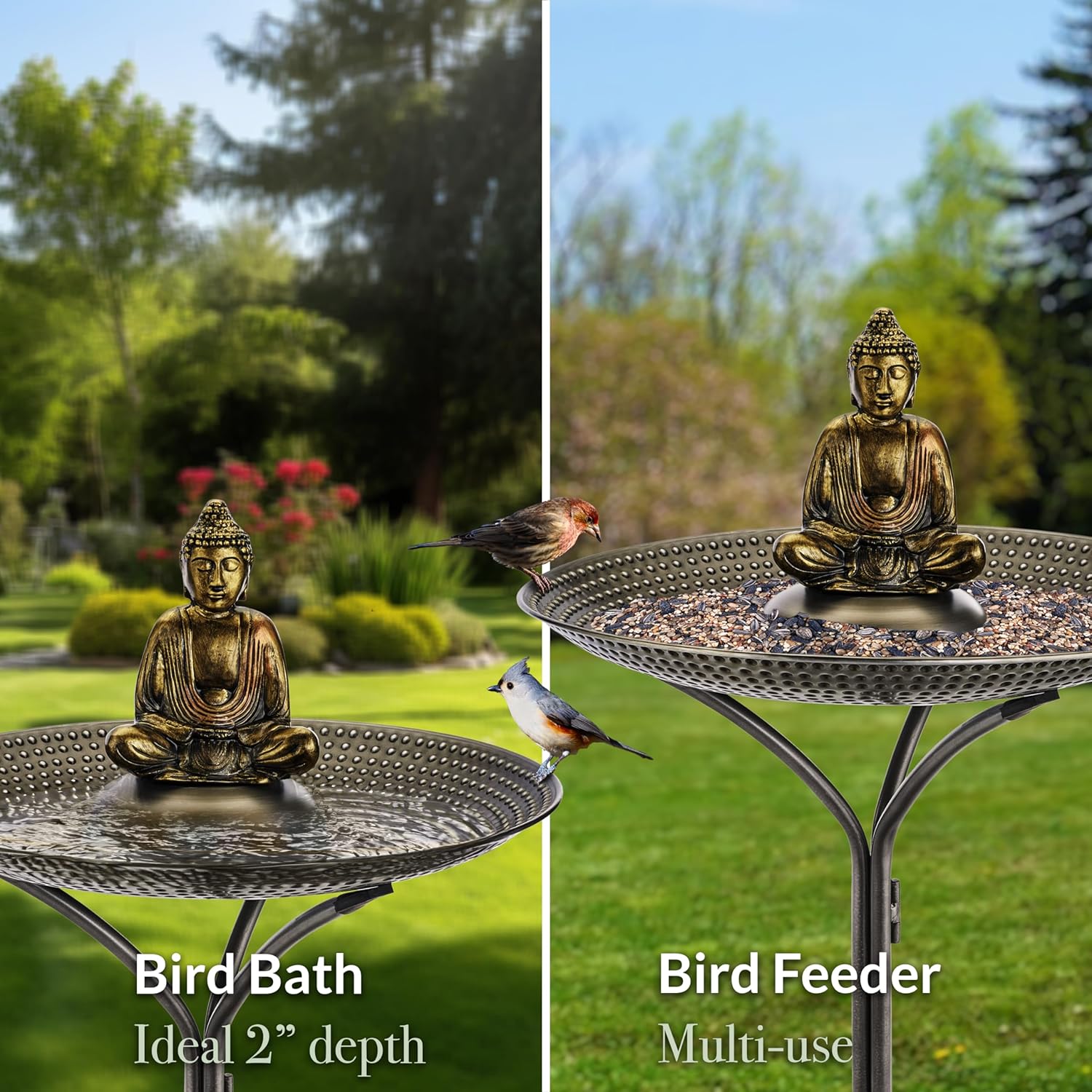 Handcrafted by American Artisans with the utmost care from premium materials, this beautiful birdbath features an inner surface of delicate hand-punched, beaded embellishments, while the basin floor showcases an intricate ‘etched linen’ design. Residing on a central pedestal, our meditating Buddha is crafted from highly durable cast aluminum coated in an aged brass finish. The elegant, collapsible pedestal stand boasts an innovative "no tip" design, and is forged from robust, powder-coated steel, guaranteeing durability. Face your birdbath’s Buddha towards your home or in a place you find calming and peaceful to reap the rewards of pausing in tranquility!
