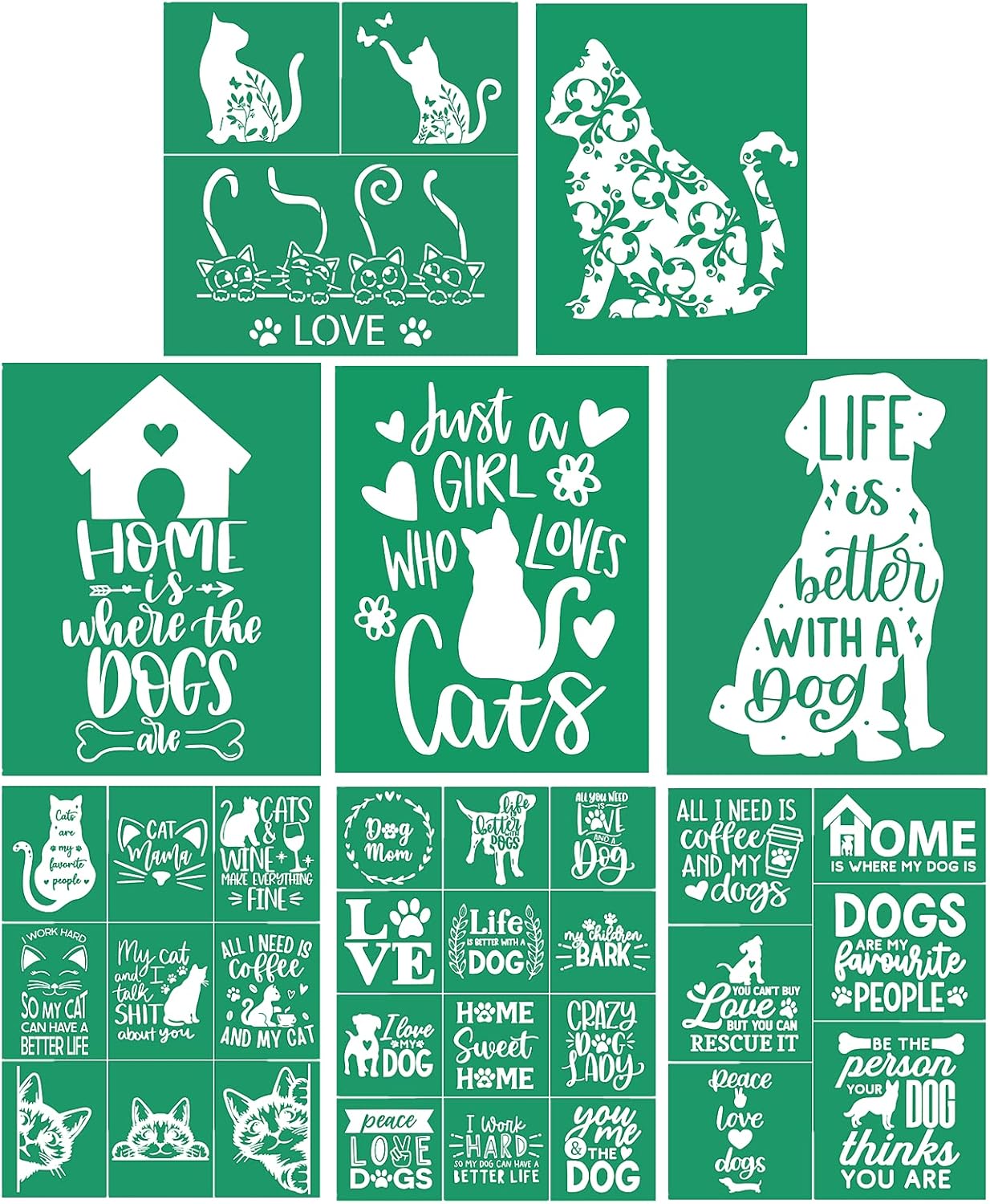 • 【Pet Theme Stencils】12 bottle chalk paste sample, 7 pcs screen printing squeegees and 8 Pcs Pet Stencils templates : Paw prints, Cat Silhouette, Cat life bundles, Dog home, Dog life, Coffee dog and animal bundle stencil, dog and cat coffee sign patterns.Great gift for Christmas, Halloween, Thanksgiving, Spring, Summer, Easter, Birthday.Gift for family, women/men, dog/cat lover, teacher or any event!