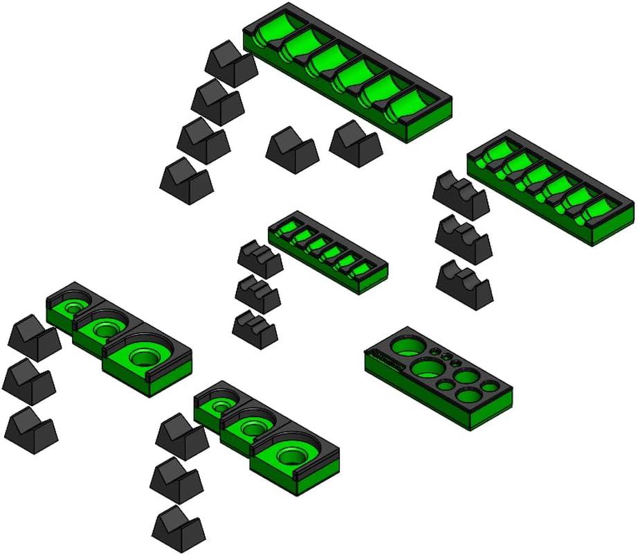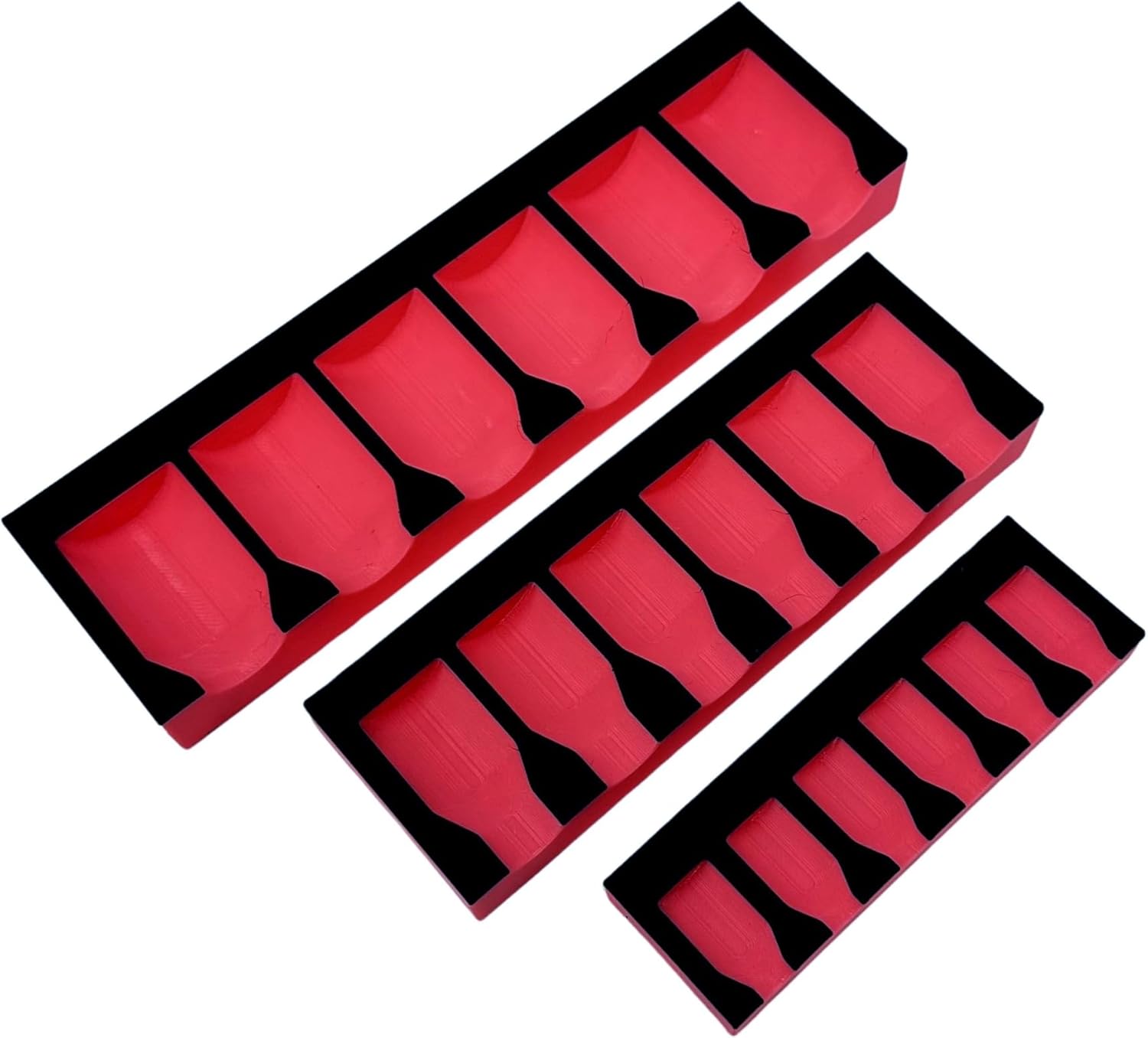 Tis bundle includes everything you need to get your Ratchets and Extensions drawers tidied up! Includes: (1) Extensions Organizer Set (Fits 24 total extensions, 6 of each size 1/4", 3/8" and 1/2") (2) Ratchet Organizers Sets (Holds a total of 6 Ratchets, 2 of Each Drive) (1) Short Extensions and Hex Organizer