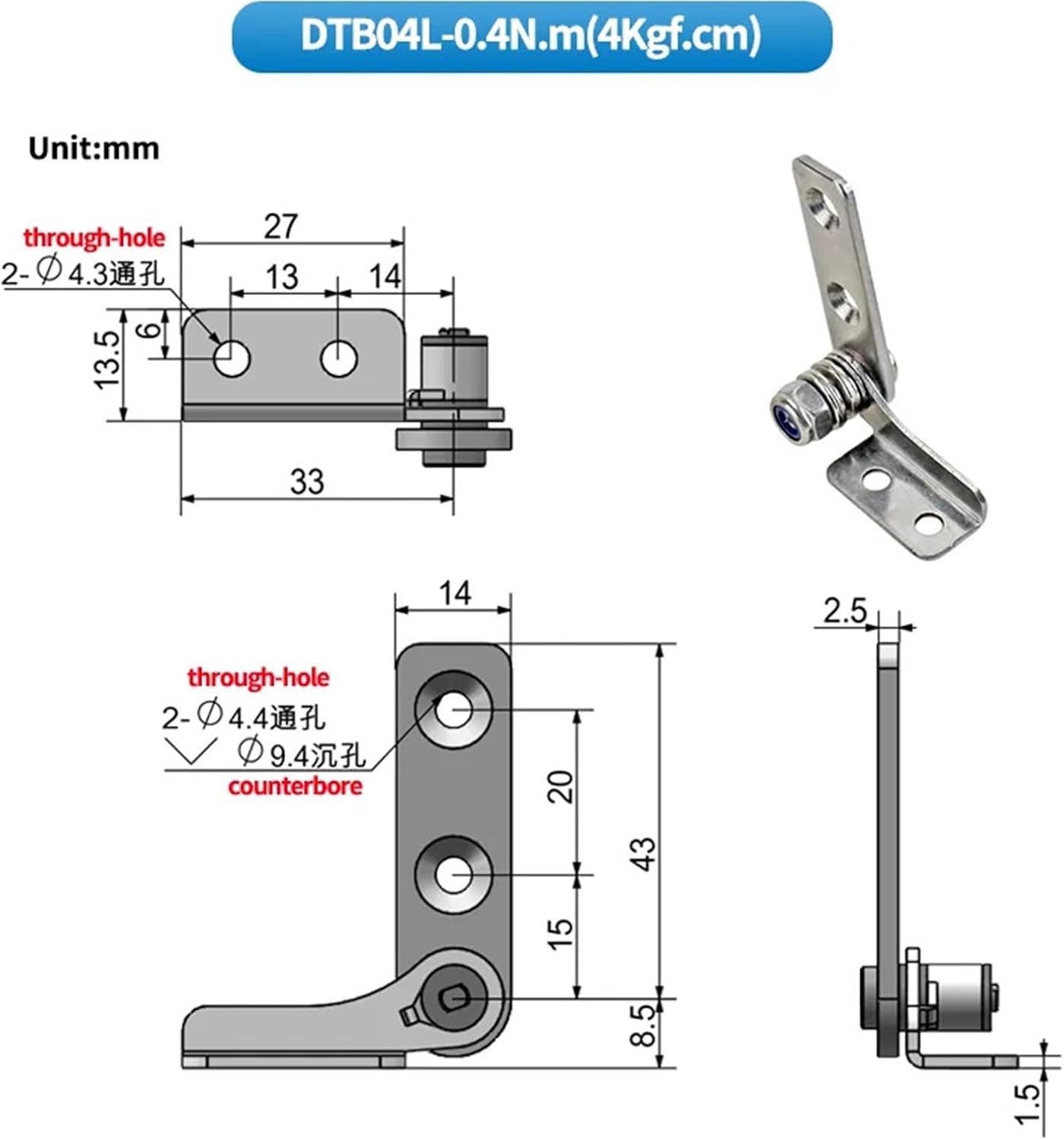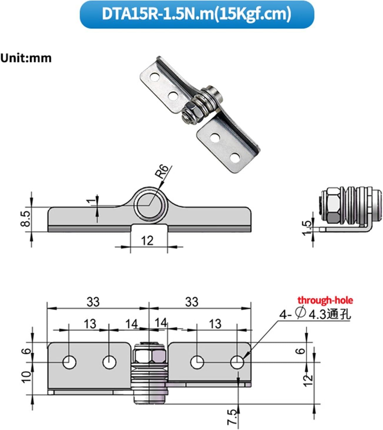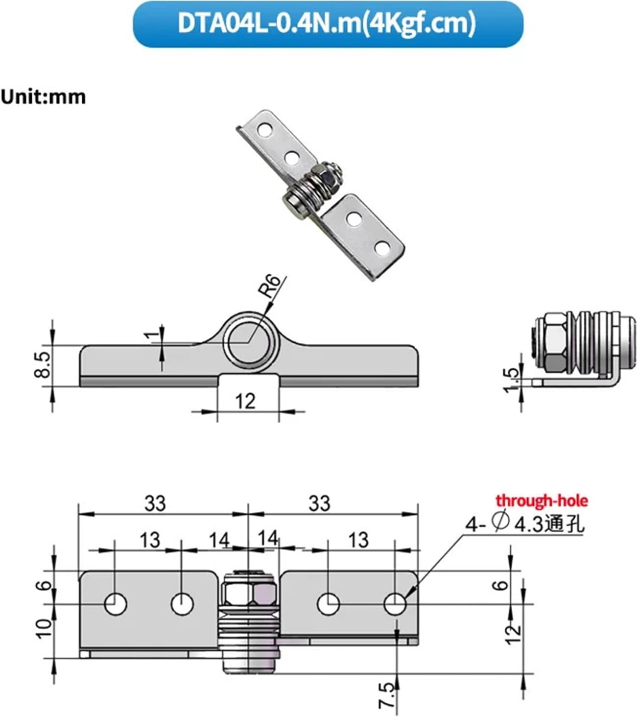 Random Stop Hinge Damping Adjustable Torque Shaft Positioning Stainless Steel 1Pcs(DTB08L-0.8N.m)