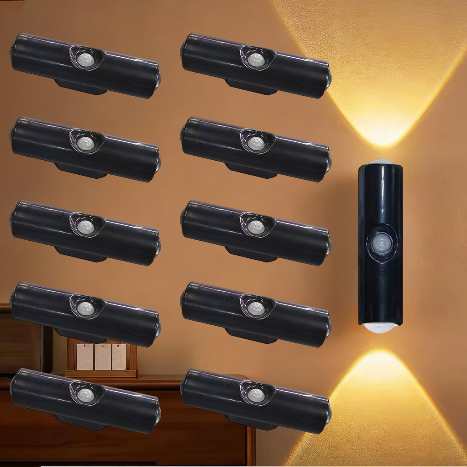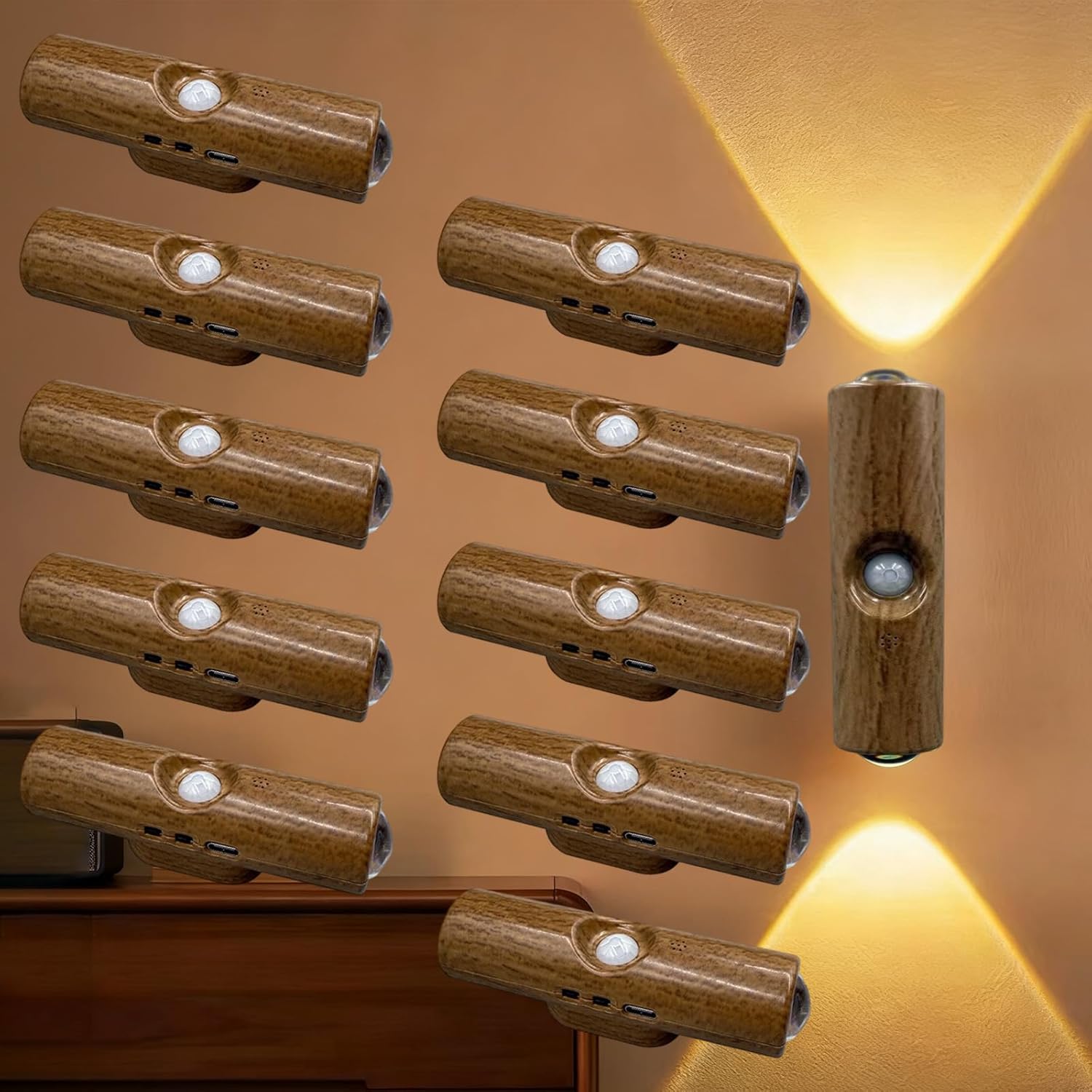 Features:Smart Motion Sensor Night Light — Advanced 110° detection activates lighting within 5 meters, ideal for bedrooms and hallwaysVersatile LED Under Cabinet Lights — Dual-color temperature with warm white for ambiance and cool white for task lightingPunch-Free Smart Sensor Magnetic Installation — Strong magnetic base with adhesive panels installs without tools or drilling on various surfacesExtended Rechargeable Battery Life — 1500mAh battery provides up to 8 hours of continuous operation with optimized power managementMulti-Surface Adaptive Lighting — Compact design fits cabinets, closets, stairs, and shelves where traditional lighting can't reachSpecification:Product Name: Rechargeable Smart LED Motion Sensor Ambient LightColor Options: White/Wood/BlackSensing Angle: 110 degrees wide-angle detectionOperating Voltage: ≤36V safe voltageWaterproof Level: Non-waterproof, for indoor use onlyProduct Dimensions: 65×55×118 mm / 34×34×150 mmPackage Includes:Smart LED Light × 1Magnetic Patch × 1USB Charging Cable × 1Warm Note:Please allow slight measurement differences due to manual measurement methodsProduct color may appear slightly different due to monitor and lighting variations