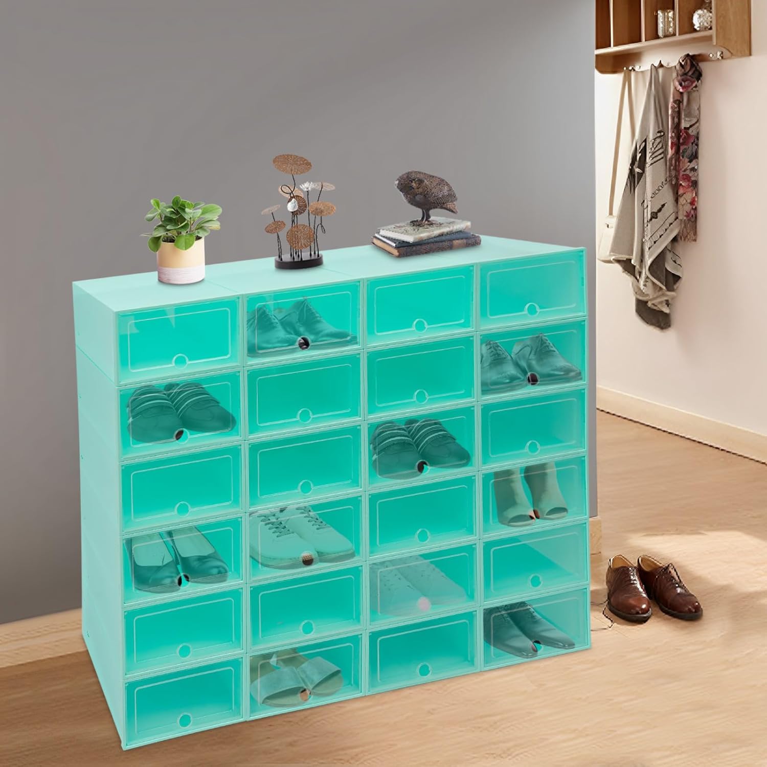 Shoe Storage Boxes Organizers, Clear Plastic Stackable 24 Pack, Shoe Rack & Holder Substitute, Sneaker Containers, Toy Storage Organizer Bins for Entryway, Closet, Under Bed, Emerald Green