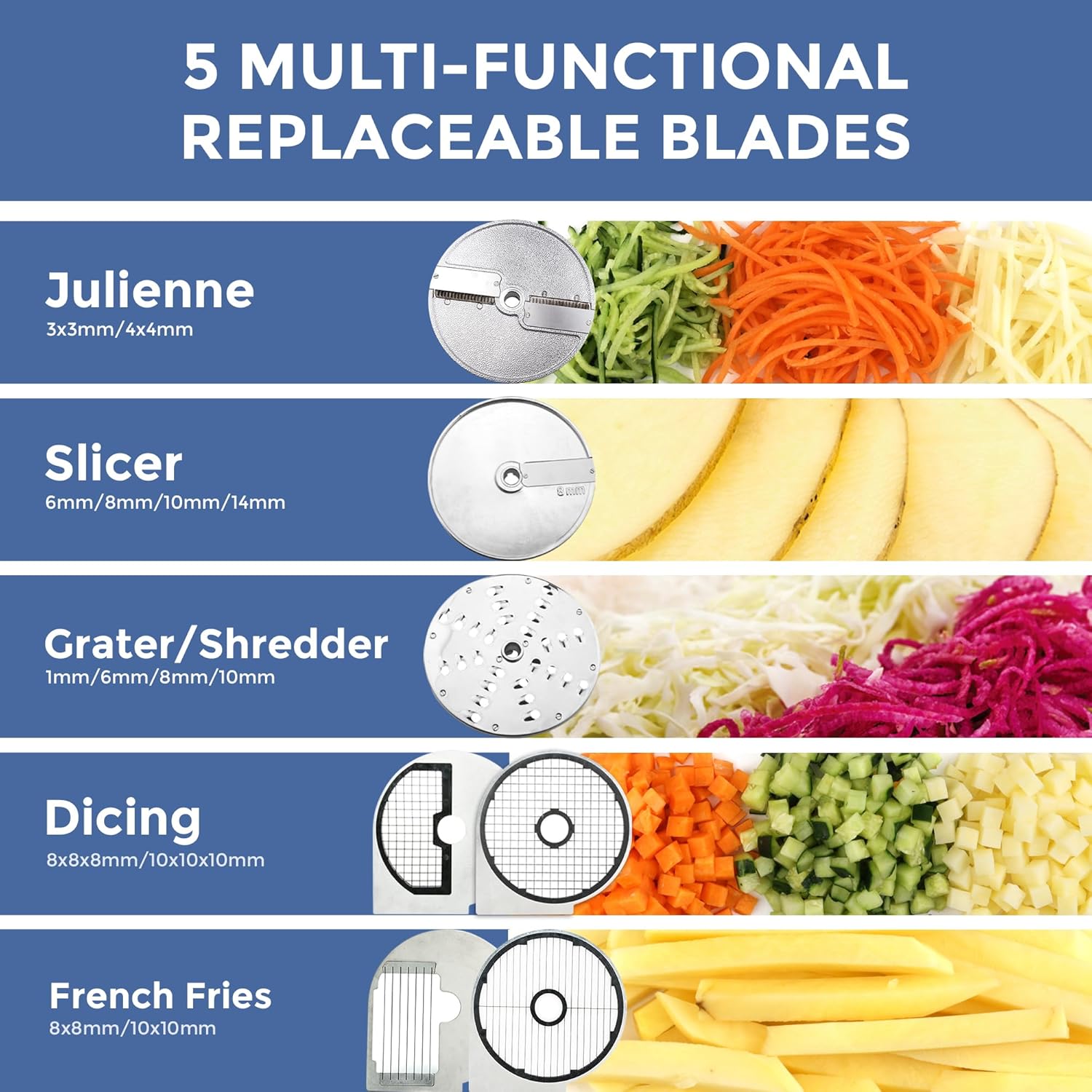 • Julienne Disc – 4x4mm: Slightly thicker julienne cut for slaws, sauté lines, or rustic texture needs.