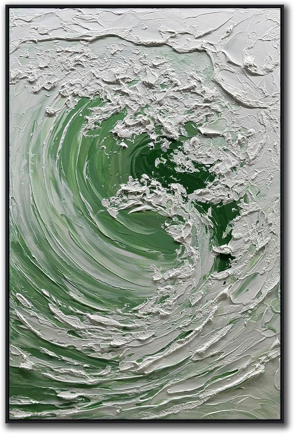 Transform your space with this stunning 28x40 inch wave oil painting that captures the raw power and beauty of the ocean. This dramatic piece features a magnificent breaking wave rendered in rich shades of blue and turquoise, set against a warm golden sunset sky. The artist's masterful use of thick, textured brushstrokes creates a remarkable 3D effect that brings the crashing wave to life, with white foam splashing dramatically at its crest. The heavy impasto technique gives the painting incredible depth and dimension, making it appear as if the wave is literally surging from the canvas. Each carefully applied layer of paint catches the light differently, creating an ever-changing display as you move around the room. The piece comes complete with a sophisticated black frame that perfectly complements the dramatic scene. This V-inspire canvas artwork makes a bold statement in any room, whether it's an office, living room, or bedroom. The generous size ensures it will command attention as a centerpiece, while the timeless subject matter appeals to both art enthusiasts and ocean lovers alike.