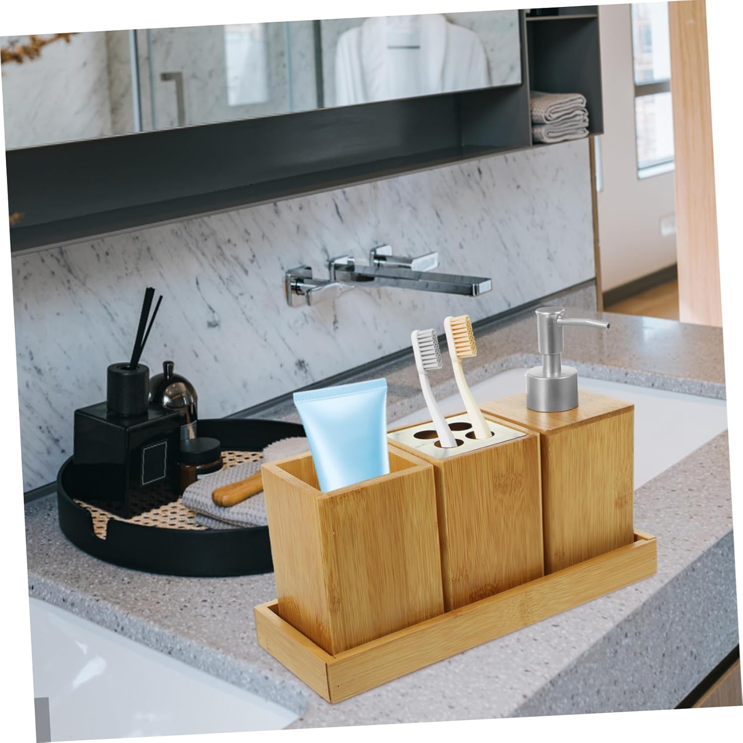 Package Include 1 1 x lotion bottle 1 x toothbrush holder 1 x mouthwash cup Characteristics -Material: brush holder -Size:24.50X9.50X2.50cm/9.63X3.73X0.98in(tray) bathrooms accessories -Color:Khaki bathroom sink accessories -Product Info:Bathroom set -Size:11.00X7.50X7.50cm/4.32X2.95X2.95in(cup) bathroom accessory -This set of bath countertop accessory can meet your essential demands, convenient to use bathroom accessories. -It's a good your lovers, family, friends, wedding or a house warming, to the bathroom with this bathroom vanity countertop accessories set toothbrush holders. -Small size and portable, convenient to carry and store. Simple and classic appearance bathroom vanity accessories. -This Bathroom Accessories Set will be a good gift choice for your lover, family, friends and colleagues restroom accessories. -Bathroom accessories set great as a stylish way to keep your bathroom essentials in one convenient place bathroom essential.Goods Informationbathrooms accessories Can be used in the kitchen, bathroom, restaurant,wedding and other occasions.toothbrush holder Perfect your families, friends, lover, colleagues, housewarming or a wedding.toothbrush holders This bathroom set includes everything you need to decorate and tidy up your countertops