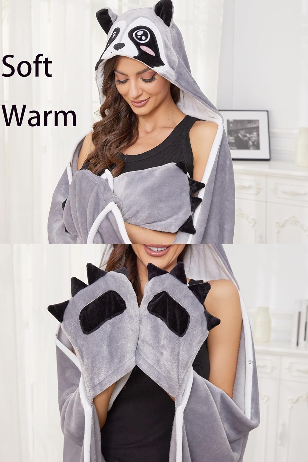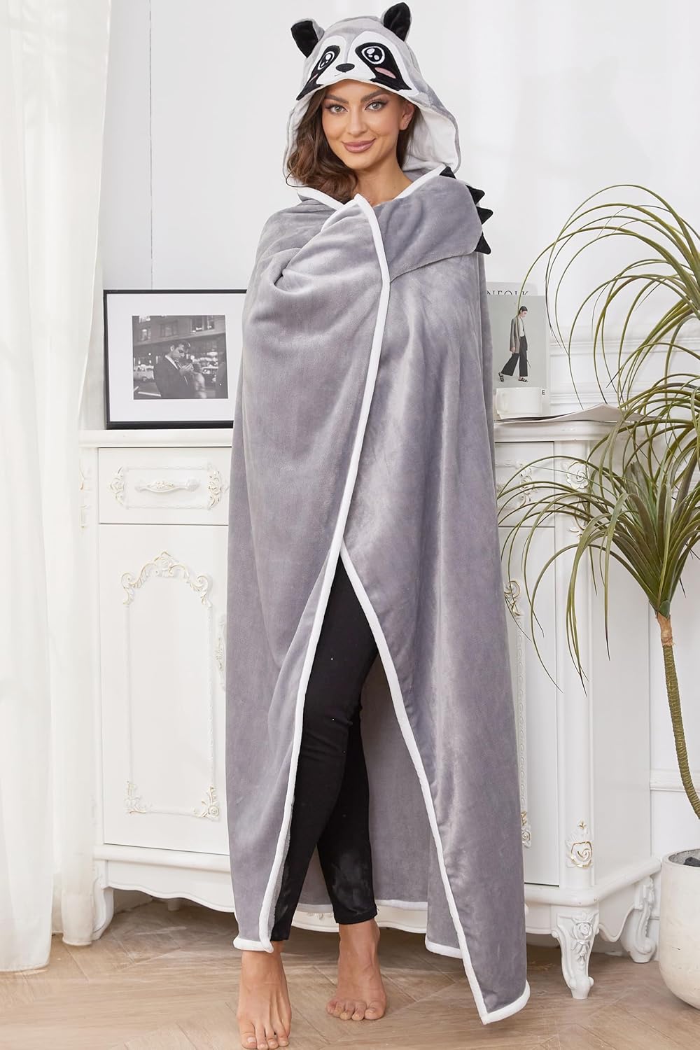The Raccoon Wearable Hooded Blanket for Adults is a must-have accessory for those seeking ultimate comfort and style. Made from super soft and warm plush flannel material, this hooded blanket will keep you cozy during chilly evenings or lazy weekends at home. Its unique design features a cute raccoon hood that adds an element of fun to your loungewear collection. With a generous size of 59" L x 51" W, this wearable blanket wraps around you like a cloak, providing full coverage and warmth from head to toe. Whether you're reading a book, watching TV, or simply relaxing, this blanket ensures maximum comfort and relaxation. This versatile hooded blanket makes a fantastic gift for both women and men. Its high-quality construction guarantees durability and long-lasting use, while the plush fabric offers a luxurious touch. Perfect for birthdays, holidays, or special occasions, this raccoon hoodie wrap will surely impress your loved ones. Embrace coziness and style with the Raccoon Wearable Hooded Blanket for Adults. Experience the ultimate relaxation while indulging in its softness and warmth. Grab yours today and enjoy the perfect companion for all your indoor lounging activities.