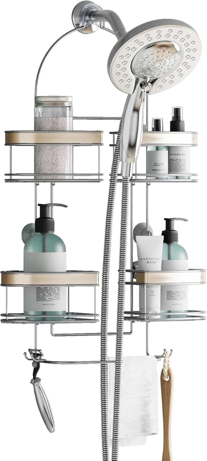 Zenith Products E7546STBB Premium Expandable Shower CaddyZenith Products Stainless Steel Expandable Shower Caddy Zenna Home Stainless Steel Expandable CaddyAll four shelves slide back and forth, allowing you to configure this organizer just the way you like. Perfect for bottles of all sizes!Stainless Steel ConstructionMoist environments like a bathroom, are particularly difficult on metal finishes - often leading to rust. Chrome finishes are coated to help prevent rust, but that can wear off. That's why we have selected premium stainless steel for construction in this unique shower caddy.Versatility of a shower caddy with room for a hand held shower headDesigned to accommodate showers with hand held shower heads. With the shelves shifted outward, water hose hangs naturally between the shelves.USA-based Customer ServiceShould you have any questions regarding our items, please don't hesitate to contact our USA-based Customer Service Department.About (ZPC) Zenith Products CorporationZenith Products is located in New Castle, Delaware. Since the 1940s, ZPC has grown into a leading bath storage and decor company offering shower rods, shower caddies, bath furniture, medicine cabinets, shower curtains/liners and other bath accessories. We are dedicated to the ongoing launching of new and innovative products, bringing you the best and most beneficial products for your home.View largerFeatures:Premium stainless steel12.25 W x 4.5 D 25.25 H inchesFour shelves slide outward to accommodate tall bottles or hand held showerheadsBottom hooks store (2) razors or hang loofahs or poofsWash cloth bars neatly store water hose. Model7446SSView largerExpanding Caddy - Chrome7546NSPView largerPremium Expanding Caddy - Chrome/NickelE7546STBBView largerPremium Expanding Caddy - Stainless SteelStainless Steel✓Extra-Long No Rust Finish✓Expandable Shelves (4)✓✓✓Swivel Collar / Suction Cup Mounting✓✓✓Hooks for Razor / Loofah Storage✓✓✓Wide Family Shelving✓✓Upgraded Wire Thickness✓✓Premium Hose Storage with Washcloth Bars✓✓
