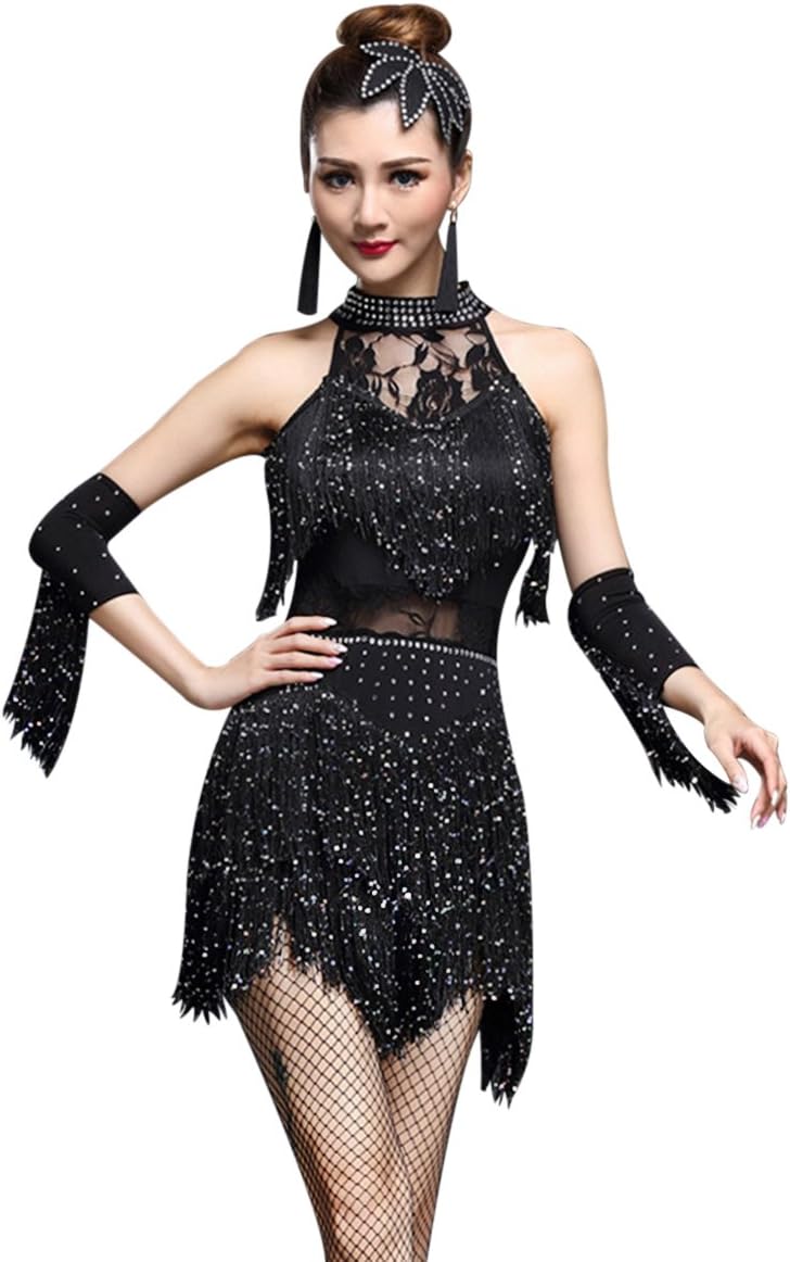 ZX Women's Rhinestone Tassel Flapper Latin Rumba Dance Dress 4 Pieces Outfits Embellishment: Lace, Rhinestone, Tassel Dress Length: Above KneeSleeve Length: SleevelessWaistline: NaturalNo. Of Piece: 4 Pieces Set Includes: Dress, Shotrts, Arm Bands Customer satisfaction is our goal. Z&X brand has alaways been very concerned provide a stylish, elegant, high-quality shopping experience of the customers.This dress consists of soft, elasticity, healthy, breathable, non-stimulating high quality spandex and milk fiber, very comfortable to wear.The dance dress designed with rhinestone, lace, sequin and fringe. Absolute latin rhythm ballroom dress.The skirt both front and back are classic irregularly high density tassel design, through the dance swing, both shining and charming. This luxury dance dress, very suitable for dance performances.Body Measurement Size Information: (cm/inch) Tag M Suggest US 2-4----------------Bust 80-88 / 31.5"-34.6"-----------------Waist 68-74 / 26.8"-29.1" Tag L Suggest US 6-8-----------------Bust 84-92 / 33.1"-36.2"-----------------Waist 72-78 / 28.3"-30.7" Tag XL Suggest US 10-12-------------Bust 88-96 / 34.6"-37.8"-----------------Waist 76-82 / 29.9"-32.3" Notice: 1.The size on the dress is Asian size, it will be smaller than US size, and each person's body is different. Please choose the fit size according to your actual situation. Thank you.2.Please allow slight deviation for the measurement data.